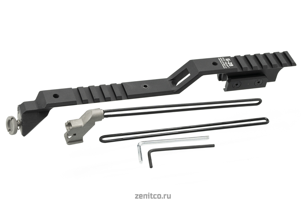 Кронштейн Б-28 формирует планку Пикатинни над целиком и ствольной коробкой АКС-74У и карабинов на его базе. В видео: